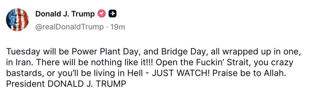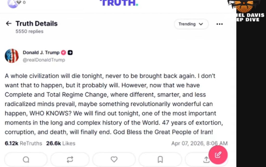 On 7 April 2026, I was on “Judging Freedom” talking with the Judge about President Trump’s shocking “Truth Social” post about Iran, where he said that “A whole civilization will die tonight, never to be brought back again.” Of course, he is saying that the US and Israel will wipe Iran off the face of the earth, which is consistent with his earlier rhetoric that he intended to bomb Iran back to the Stone Age, if it does not concede defeat.